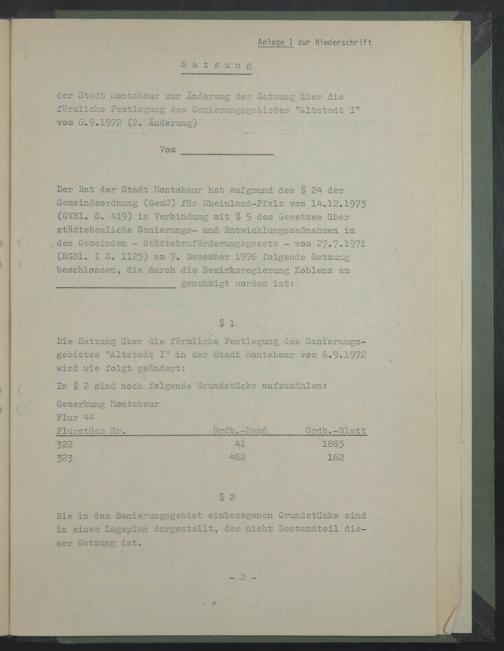 Der Rat der Stadt Montabaur hat aufgrund des § 24 der Gemeindeordnung (GemO) für Rheinland-Pfalz vom 14.12.1973 (GVB1. S. 419) in Verbindung mit § 3 des Gesetzes über städtebauliche Sanierungs- und Entwicklungsmaßnahmen in den Gemeinden - Städtebauförderungsgesetz - vom 27-7.1971 (BGBl. I S. 1123) am 7- Dezember 1976 folgende Satzung beschlossen, die durch die Bezirksregierung Koblenz am _ genehmigt worden ist: