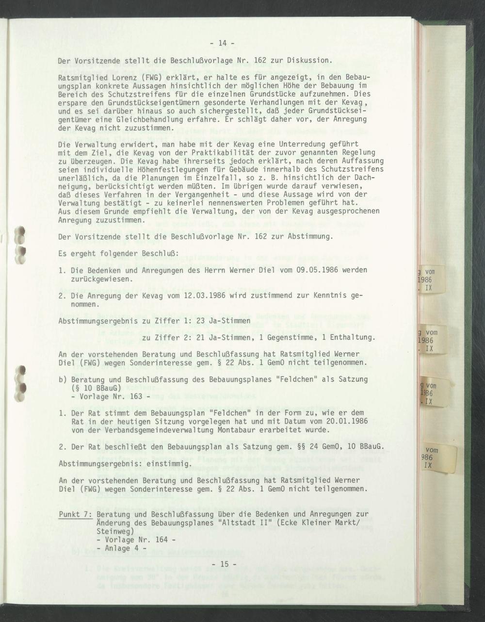 An der vorstehenden Beratung und Beschlußfassung hat Ratsmitglied Werner Diel (FWG) wegen Sonderinteresse gern. § 22 Abs. 1 GemO nicht tellgenommen.