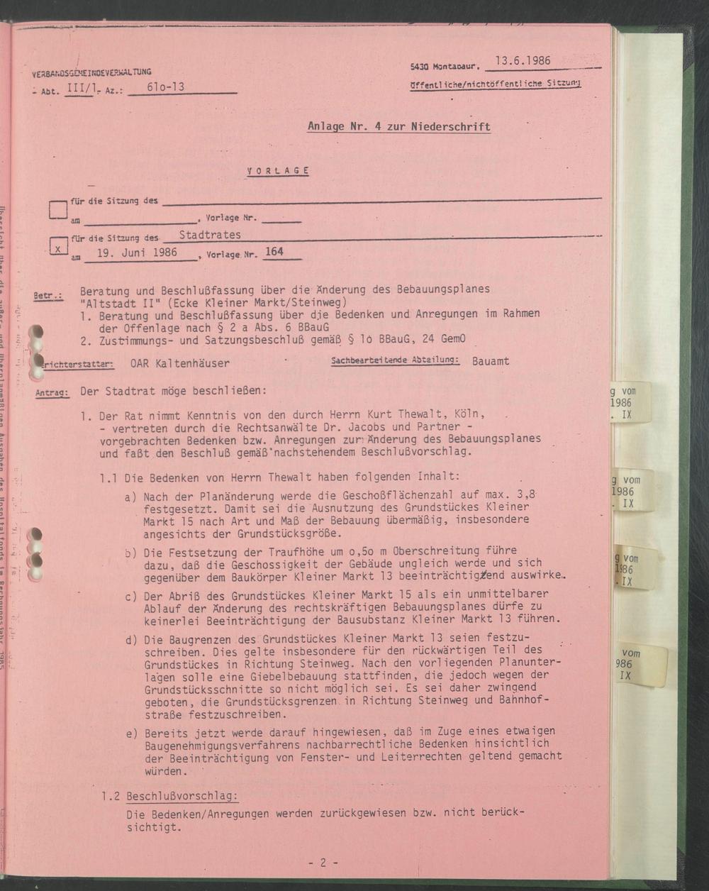 - vertreten durch die Rechtsanwälte Dr. Jacobs und Partner - vorgebrachten Bedenken bzw. Anregungen zur;Änderung des Bebauungsplanes und faßt den Beschluß gemäß'nachstehendem Beschlußvorschlag.