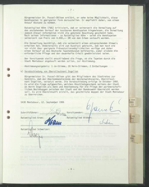 Bürgermeister Dr. Possel-Dölken gibt den Mitgliedern des Stadtrates zur Kenntnis, daß der Oberkommandierende der Westerwaldkaserne, Oberstleutnant Engelien, versetzt werde. Die Verabschiedung erfolge im Oktober 1986.