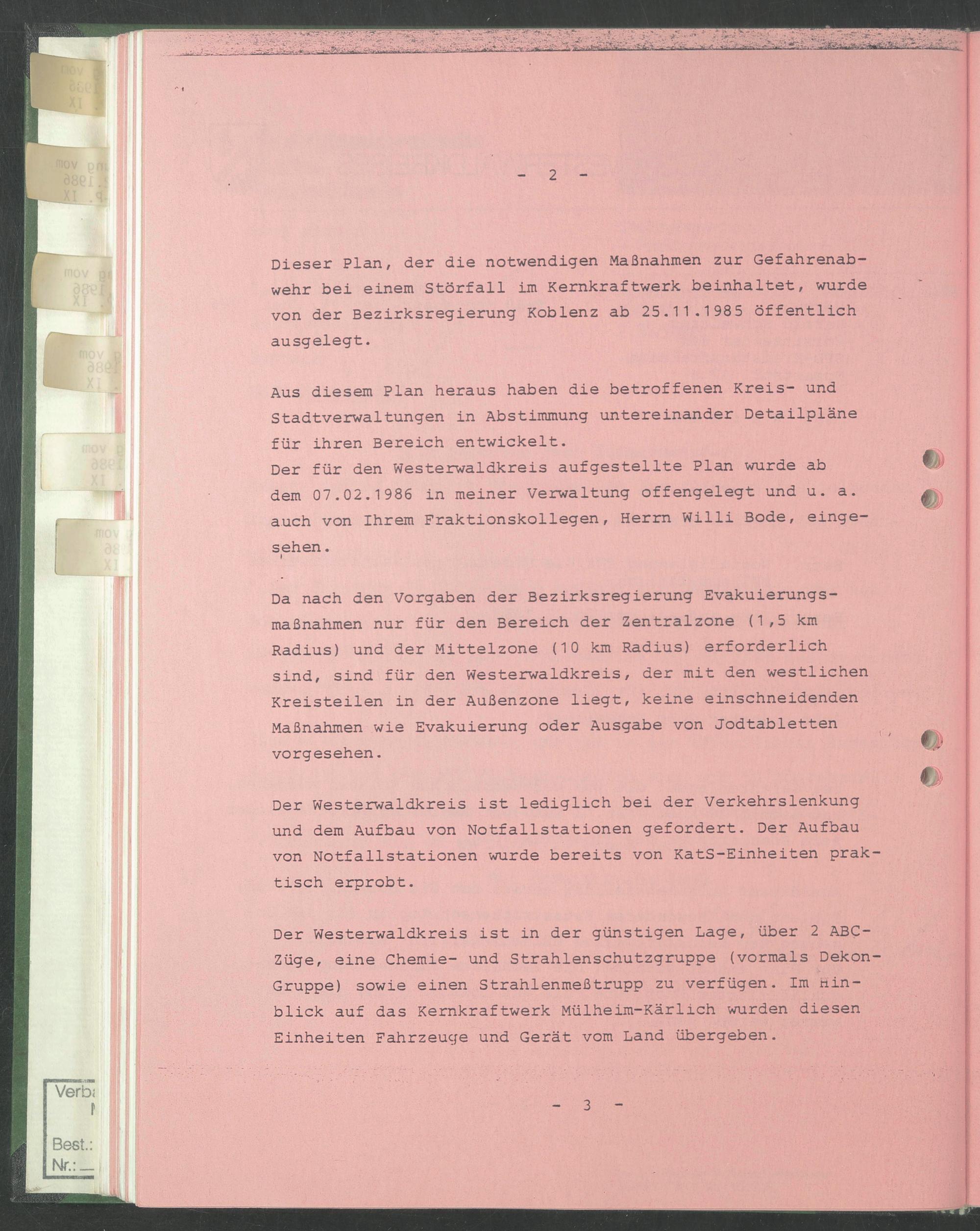 Der für den Westerwaldkreis aufgestellte Plan wurde ab dem 07.02.1986 in meiner Verwaltung offengelegt und u. a. auch von Ihrem Fraktionskollegen, Herrn Willi Bode, eingesehen .