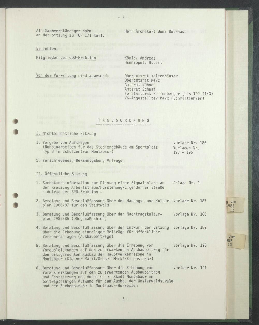 2. Beratung und Beschlußfassung über den Hauungs- und Kultur- Vorlage Nr. 187 plan 1986/87 für den Stadtwald