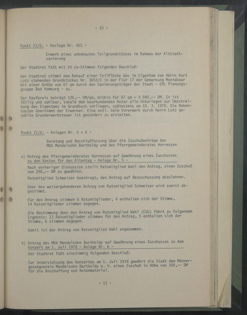 Zur Unterstützung des Konzertes am 1. Juli 1978 gewährt die Stadt dem Männergesangverein Mendelsohn Bartholdy e. V. einen Zuschuß in Höhe von 500,-- DM für die Anschaffung von Notenmaterial.