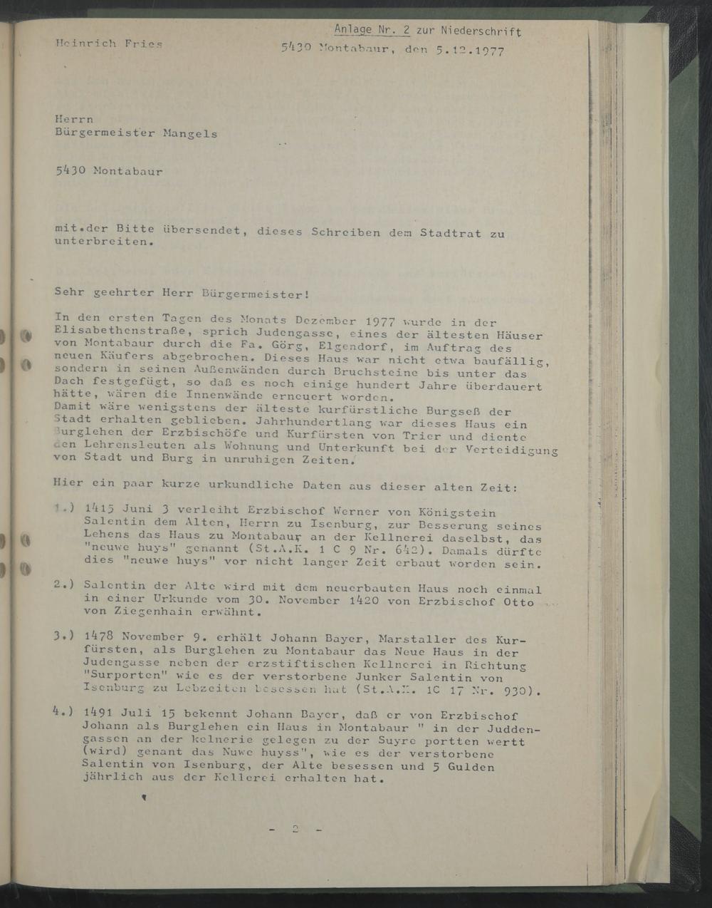 fürsten, als Burglehen zu Montabaur das Neue Haus in der Judengasse neben der erzstiftischcn Kcllncrci in Richtung "Surportcn" wie es der verstorbene Junker Salentin von Isenburg zu Lebzeiten besessen hat (St.A.K. IC 17 Nr. 930).
