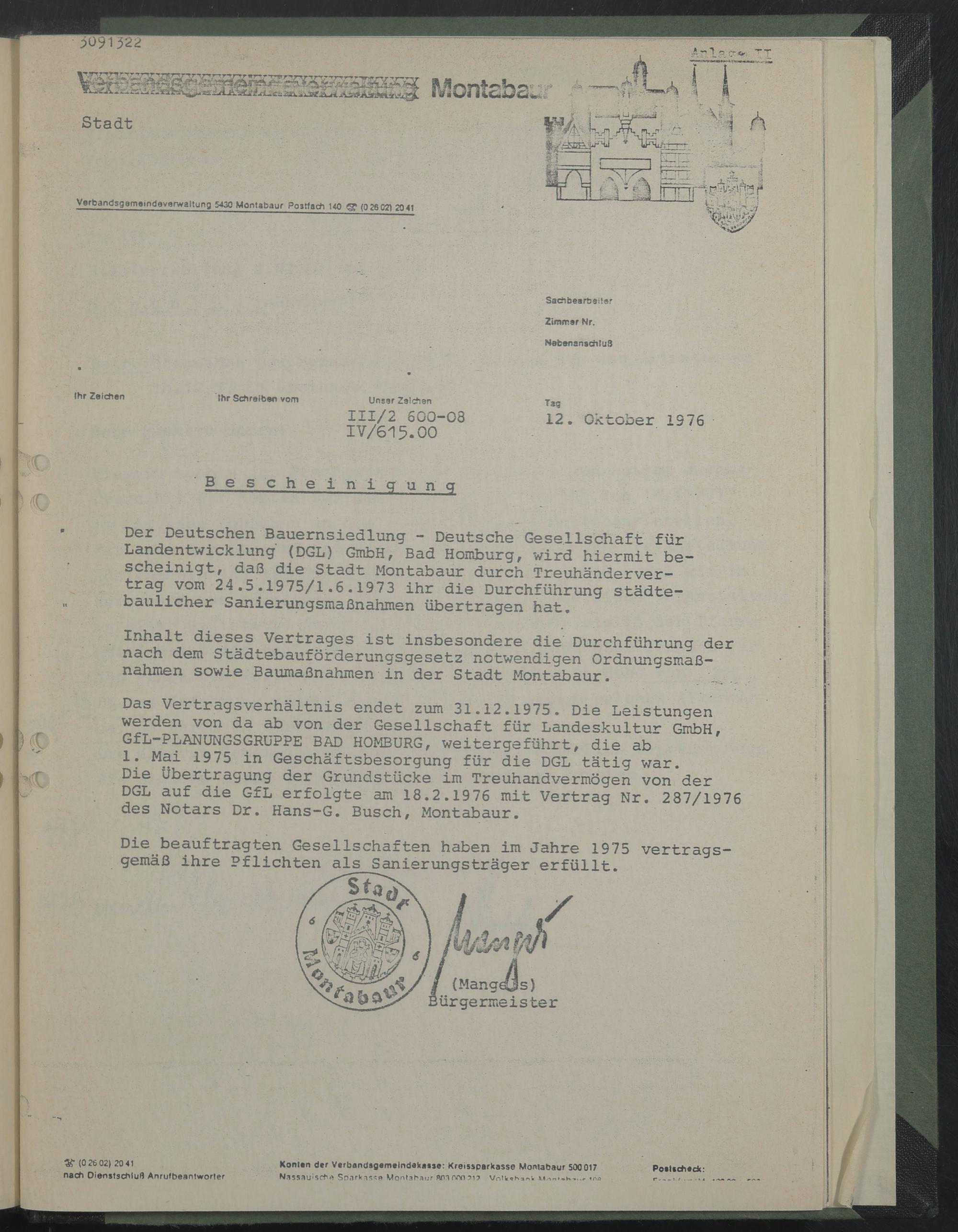 Der Deutschen Bauernsiedlung - Deutsche Gesellschaft für Landentwicklung (DGL) GmbH, Bad Homburg, wird hiermit bescheinigt, daB die Stadt Montabaur durch Treuhändervertrag vom 24.5.1975/1.6.1973 ihr die Durchführung städtebaulicher Sanierungsmaßnahmen übertragen hat.