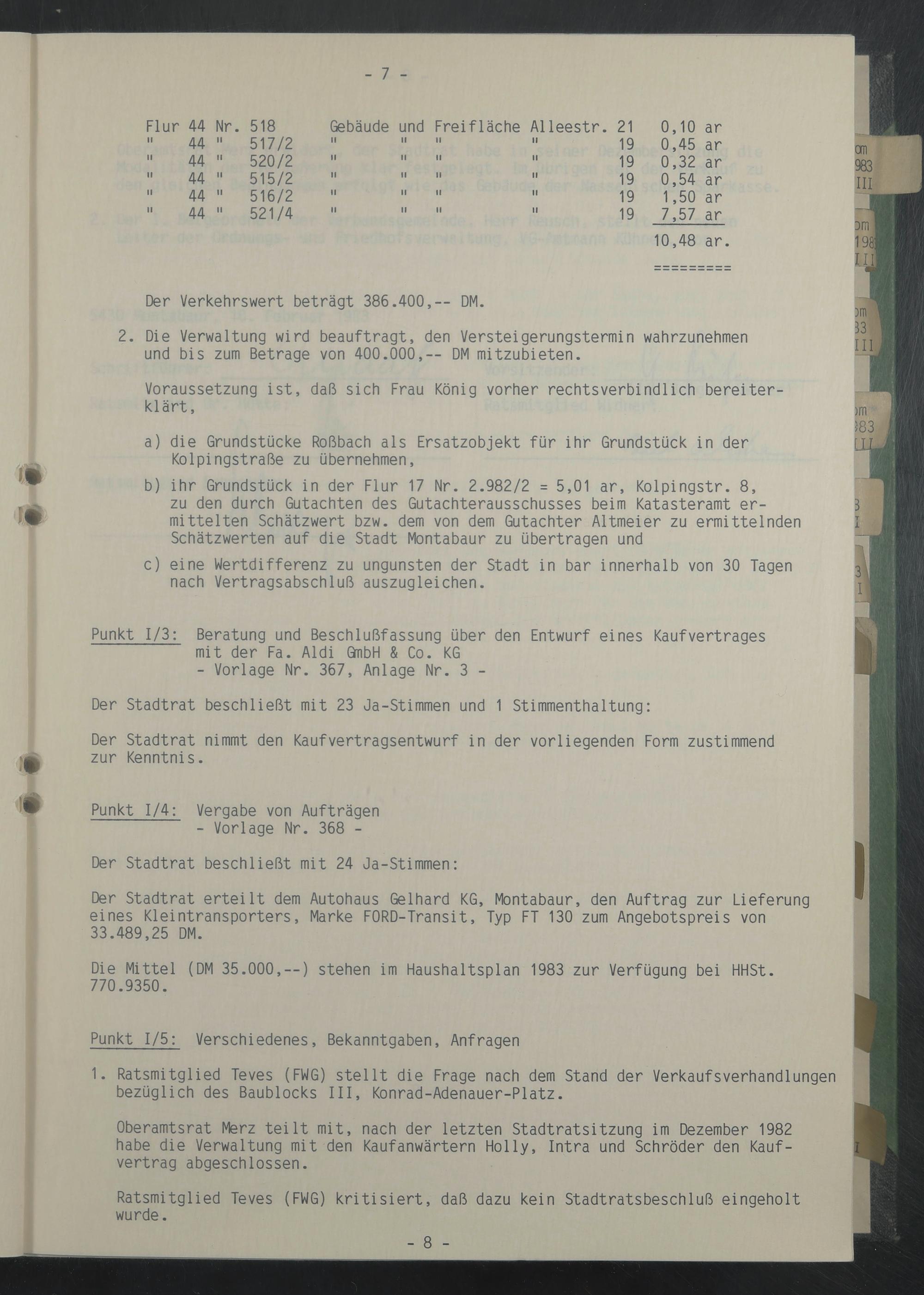 Oberamtsrat Merz teilt mit, nach der letzten Stadtratsitzung im Dezember 1982 habe die Verwaltung mit den Kaufanwärtern Holly, Intra und Schröder den Kaufvertrag abgeschlossen.