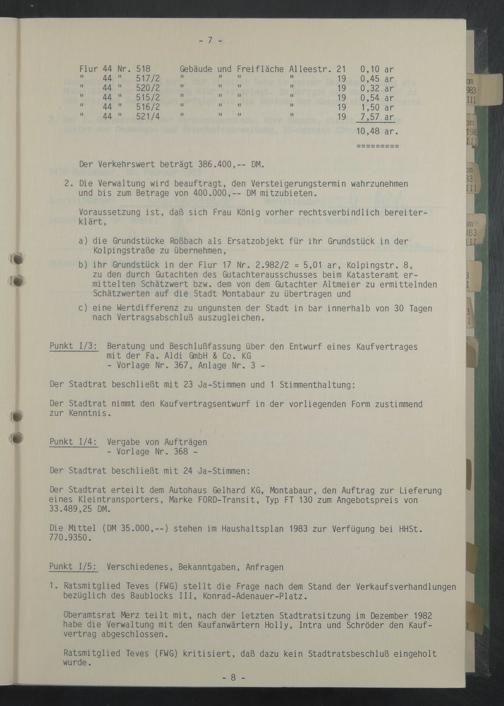 Punkt 1/3: Beratung und Beschlußfassung über den Entwurf eines Kaufvertrages mit der Fa. Aldi GmbH & Co. KG