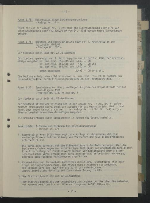 Der Stadtrat beschließt zur Umschuldung zinsungünstiger Darlehen die Aufnahme von Kommunalkrediten bis zur Höhe von insgesamt 6.500.000,-- DM.