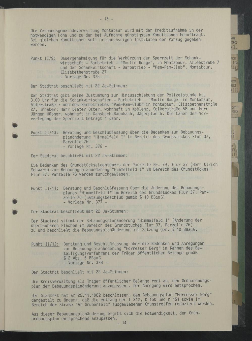 Punkt 11/9: Dauergenehmigung für die Verkürzung der Sperrzeit der Schankwirtschaft - Barbetrieb - "Moulin Rouge", in Montabaur, Alleestraße 7 und der Schankwirtschaft - Barbetrieb - "Pam-Pam-Club", Montabaur, Elisabethenstraße 27 - Vorlage Nr. 375 -