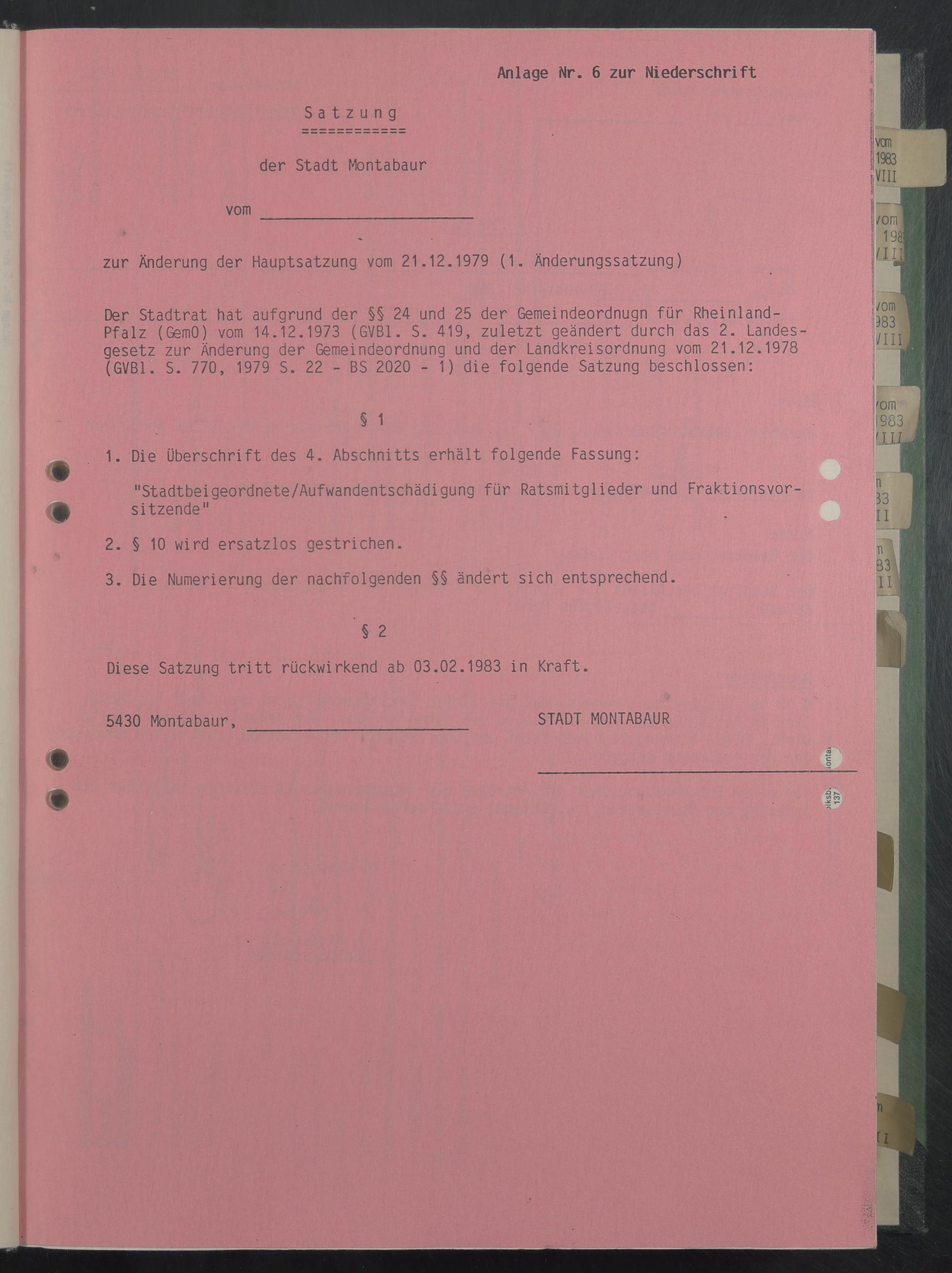 Der Stadtrat hat aufgrund der §§ 24 und 25 der Gemeindeordnugn für Rheinland- Pfalz (GemO) vom 14.12.1973 (GVB1. S. 419, zuletzt geändert durch das 2. Landesgesetz zur Änderung der Gemeindeordnung und der Landkreisordnung vom 21.12.1978 (GVB1. S. 770, 1979 S. 22 - BS 2020 - 1) die folgende Satzung beschlossen: