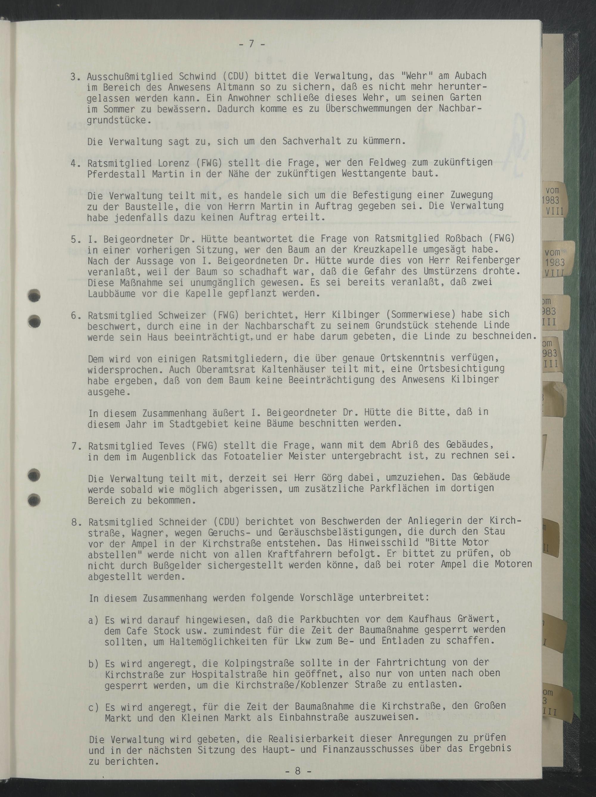 In diesem Zusammenhang äußert I. Beigeordneter Dr. Hütte die Bitte, daß in diesem Jahr im Stadtgebiet keine Bäume beschnitten werden.