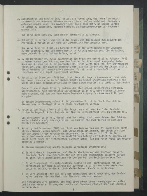 Dem wird von einigen Ratsmitgliedern, die über genaue Ortskenntnis verfügen, widersprochen. Auch Oberamtsrat Kaltenhäuser teilt mit, eine Ortsbesichtigung habe ergeben, daß von dem Baum keine Beeinträchtigung des Anwesens Kilbinger ausgehe.