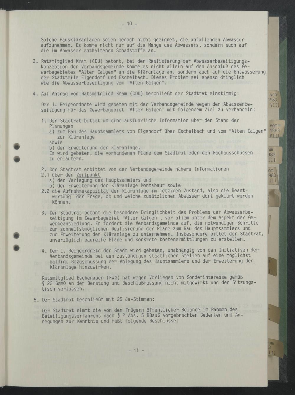 Ratsmitglied Kram (CDU) betont, bei der Realisierung der Abwasserbeseitigungskonzeption der Verbandsgemeinde komme es nicht allein auf den Anschluß des Gewerbegebietes "Alter Galgen" an die Kläranlage an, sondern auch auf die Entwässerung der Stadtteile Eigendorf und Eschelbach. Dieses Problem sei ebenso dringlich wie die Abwasserbeseitigung vom "Alten Galgen".