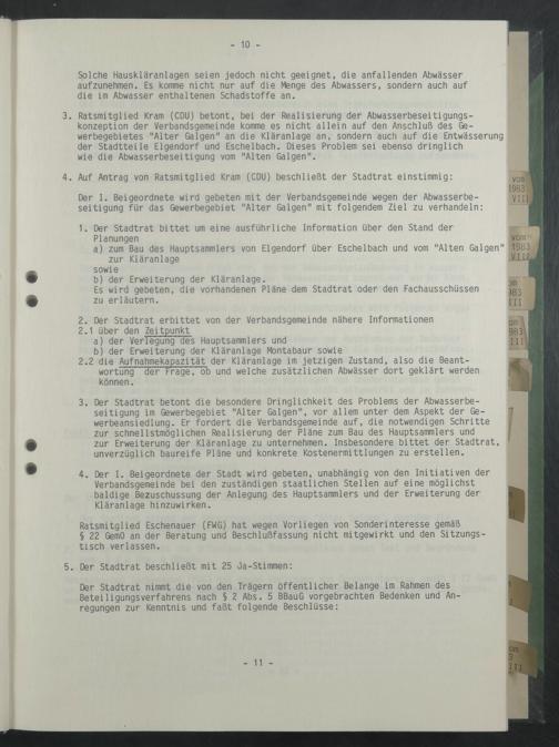 4. Der I. Beigeordnete der Stadt wird gebeten, unabhängig von den Initiativen der Verbandsgemeinde bei den zuständigen staatlichen Stellen auf eine möglichst baldige Bezuschussung der Anlegung des Hauptsammlers und der Erweiterung der Kläranlage hinzuwirken.