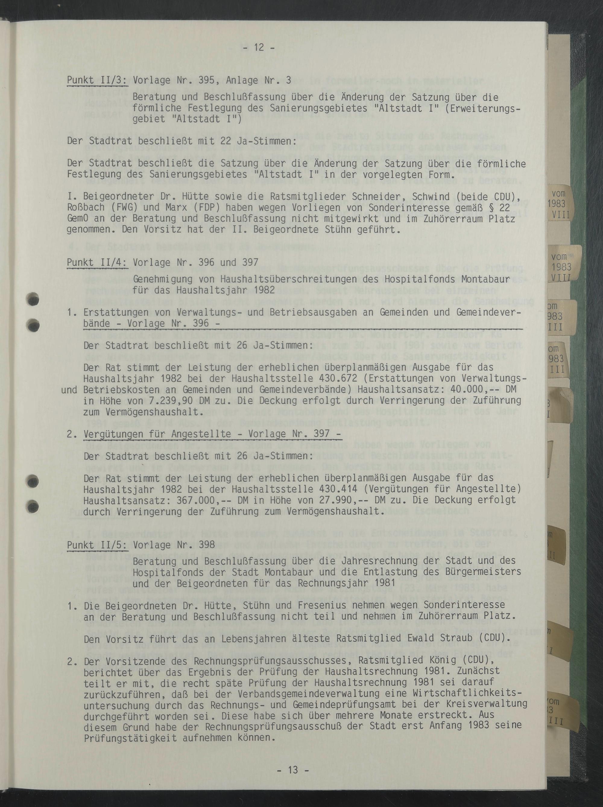 I. Beigeordneter Dr. Hütte sowie die Ratsmitglieder Schneider, Schwind (beide CDU), Roßbach (FWG) und Marx (FDP) haben wegen Vorliegen von Sonderinteresse gemäß § 22 GemO an der Beratung und Beschlußfassung nicht mitgewirkt und im Zuhörerraum Platz genommen. Den Vorsitz hat der II. Beigeordnete Stühn geführt.