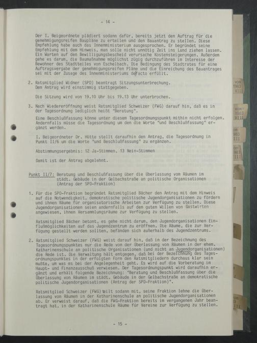 Ratsmitglied Schweizer (FWG)teilt sodann mit, seine Fraktion lehne die Überlassung von Räumen in der Katharinenschule an politische Jugendorganisationen ab. Er verweist darauf, daß die FWG-Fraktion bereits im vergangenen Jahr beantragt hat, in der Katharinenschule Räume für Vereine zur Verfügung zu stellen.
