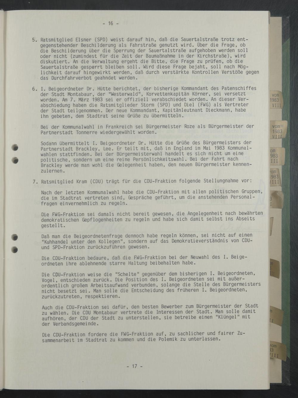 I. Beigeordneter Dr. Hütte berichtet, der bisherige Kommandant des Patenschiffes der Stadt Montabaur, der "Westerwald", Korvettenkapitän Körner, sei versetzt worden. Am 7. März 1983 sei er offiziell verabschiedet worden. An dieser Verabschiedung haben die Ratsmitglieder Storm (SPD) und Diel (FWG) als Vertreter der Stadt teilgenommen. Der neue Kommandant, Kapitänleutnant Dieckmann, habe ihn gebeten, dem Stadtrat seine Grüße zu übermitteln.