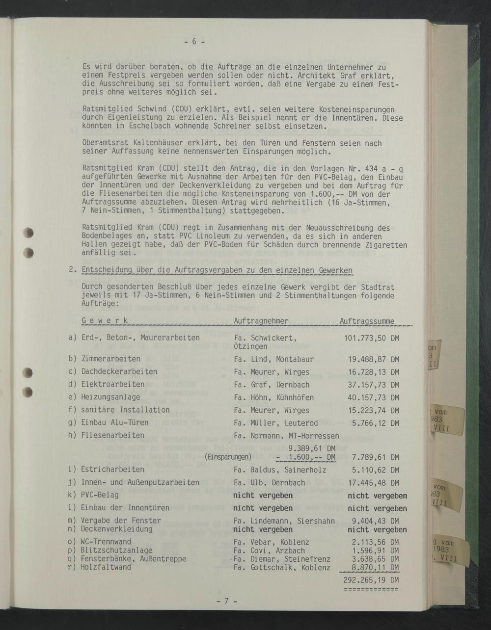 Durch gesonderten Beschluß über jedes einzelne Gewerk vergibt der Stadtrat jeweils mit 17 Ja-Stimmen, 6 Nein-Stimmen und 2 Stimmenthaltungen folgende Aufträge: