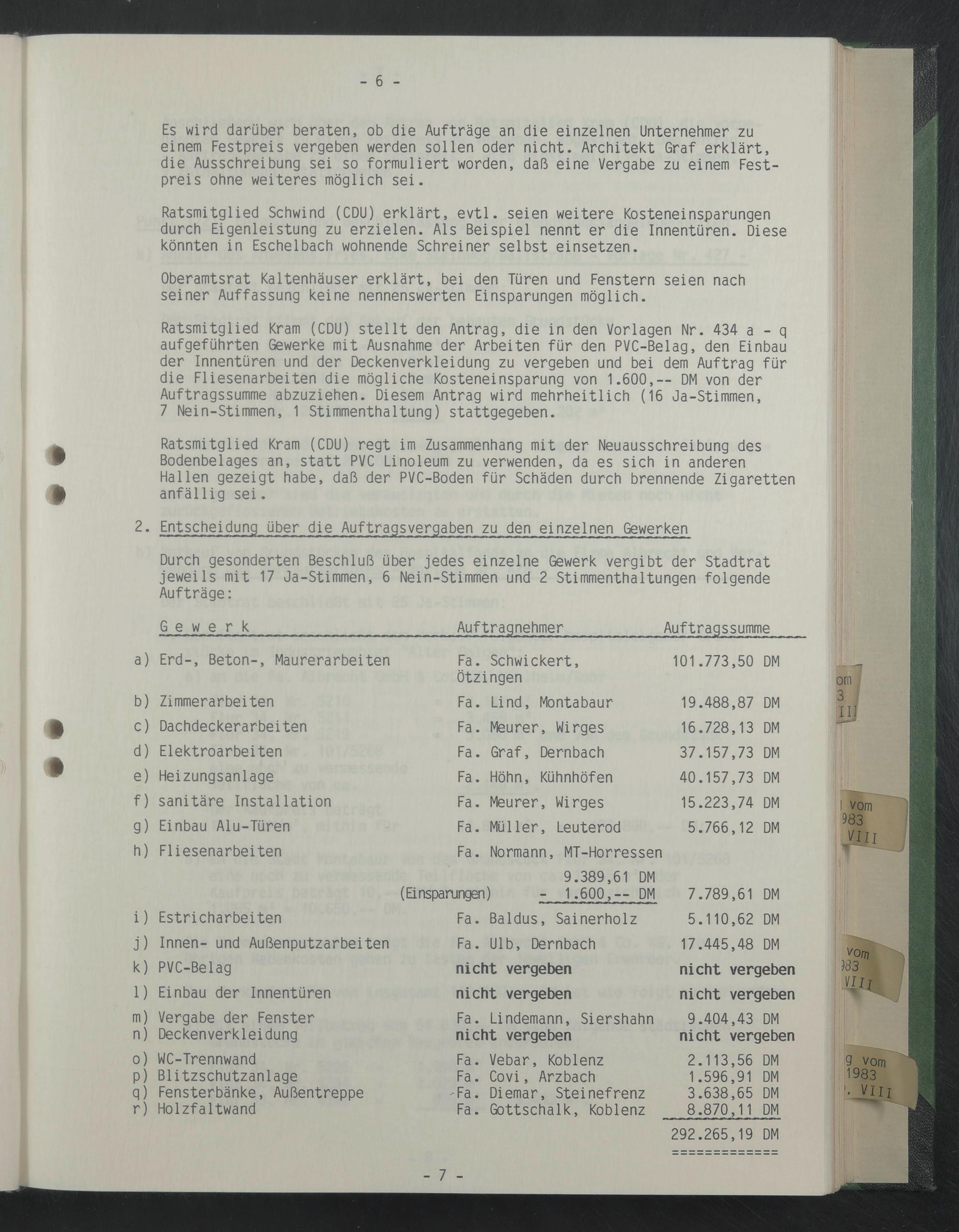 Ratsmitglied Kram (CDU) stellt den Antrag, die in den Vorlagen Nr. 434 a - q aufgeführten Gewerke mit Ausnahme der Arbeiten für den PVC-Belag, den Einbau der Innentüren und der Deckenverkleidung zu vergeben und bei dem Auftrag für die Fliesenarbeiten die mögliche Kosteneinsparung von 1.600,-- DM von der Auftragssumme abzuziehen. Diesem Antrag wird mehrheitlich (16 Ja-Stimmen,