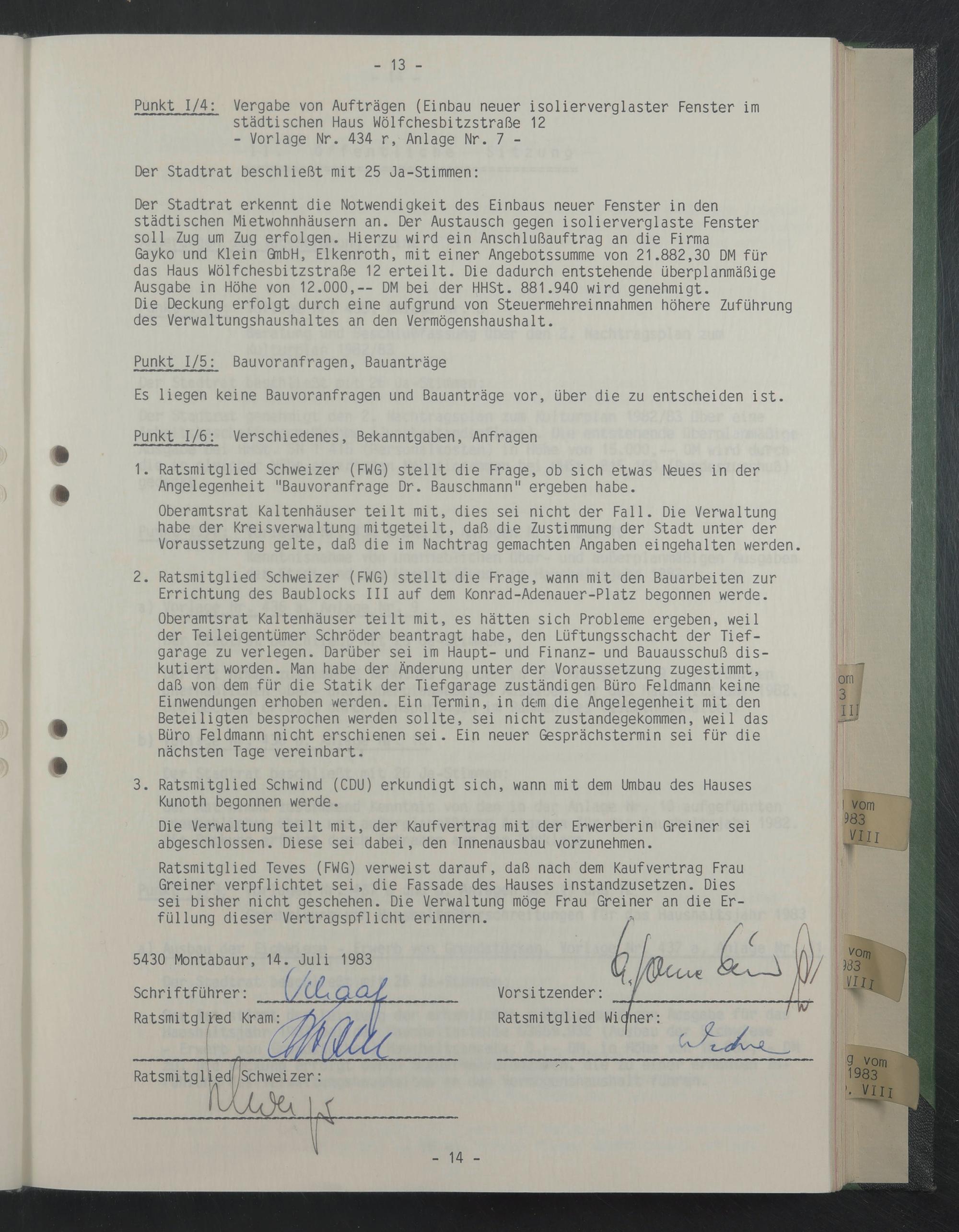 Der Stadtrat erkennt die Notwendigkeit des Einbaus neuer Fenster in den städtischen Mietwohnhäusern an. Der Austausch gegen isolierverglaste Fenster soll Zug um Zug erfolgen. Hierzu wird ein Anschlußauftrag an die Firma Gayko und Klein GmbH, Elkenroth, mit einer Angebotssumme von 21.882,30 DM für das Haus Wölfchesbitzstraße 12 erteilt. Die dadurch entstehende überplanmäßige Ausgabe in Höhe von 12.000,-- DM bei der HHSt. 881.940 wird genehmigt.