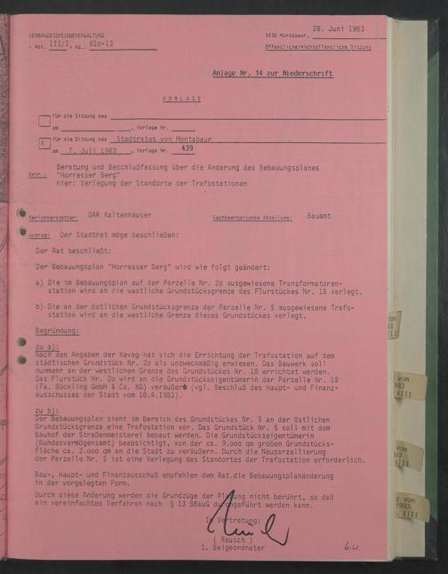 Nach den Angaben der Kevag- hat sich die Errichtung der Trafostation auf dem städtischen Grundstück Nr. 2o als unzweckmäßig erwiesen. Das Bauwerk soll nunmehr an der westlichen Grenze des Grundstückes Nr. 18 errichtet werden.