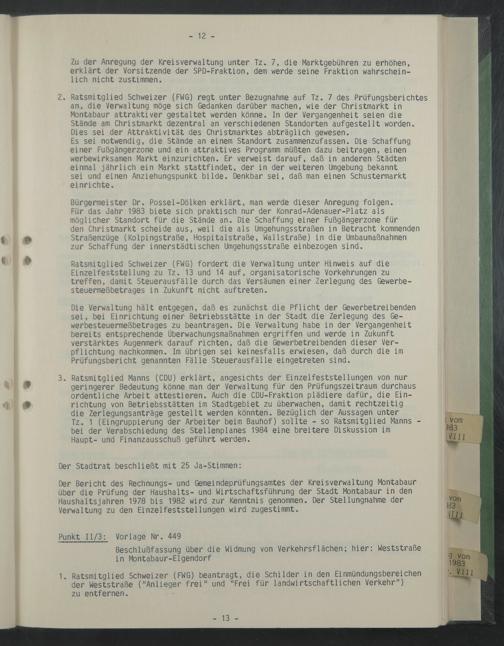 Für das Jahr 1983 biete sich praktisch nur der Konrad-Adenauer-Platz als möglicher Standort für die Stände an. Die Schaffung einer Fußgängerzone für den Christmarkt scheide aus, weil die als Umgehungsstraßen in Betracht kommenden Straßenzüge (Kolpingstraße, Hospitalstraße, Wallstraße) in die Umbaumaßnahmen zur Schaffung der innerstädtischen Umgehungsstraße einbezogen sind.