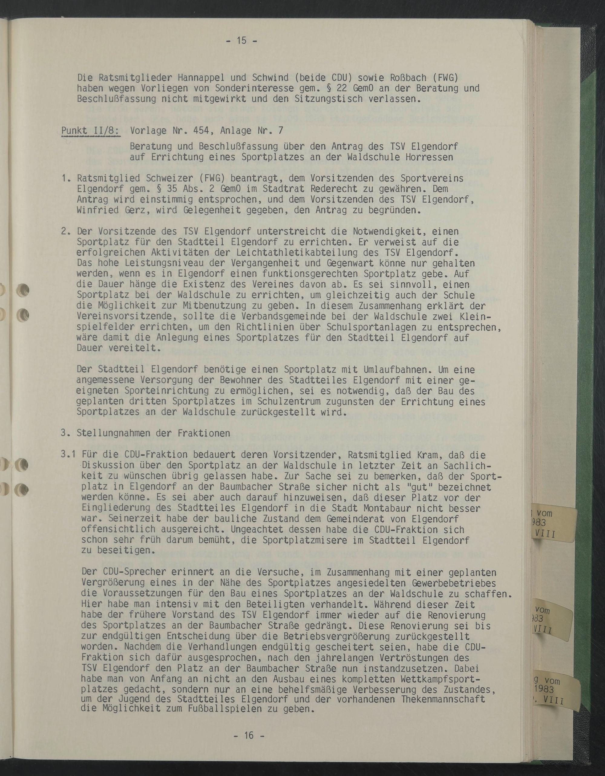Die Ratsmitglieder Hannappel und Schwind (beide CDU) sowie Roßbach (FWG) haben wegen Vorliegen von Sonderinteresse gern. § 22 GemO an der Beratung und Beschlußfassung nicht mitgewirkt und den Sitzungstisch verlassen.