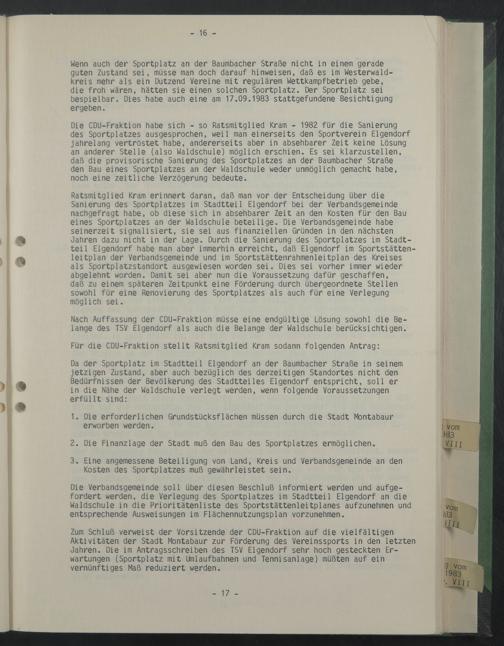 Die CDU-Fraktion habe sich - so Ratsmitglied Kram - 1982 für die Sanierung des Sportplatzes ausgesprochen, weil man einerseits den Sportverein Eigendorf jahrelang vertröstet habe, andererseits aber in absehbarer Zeit keine Lösung an anderer Stelle (also Waldschule) möglich erschien. Es sei klarzustellen, daß die provisorische Sanierung des Sportplatzes an der Baumbacher Straße den Bau eines Sportplatzes an der Waldschule weder unmöglich gemacht habe, noch eine zeitliche Verzögerung bedeute.