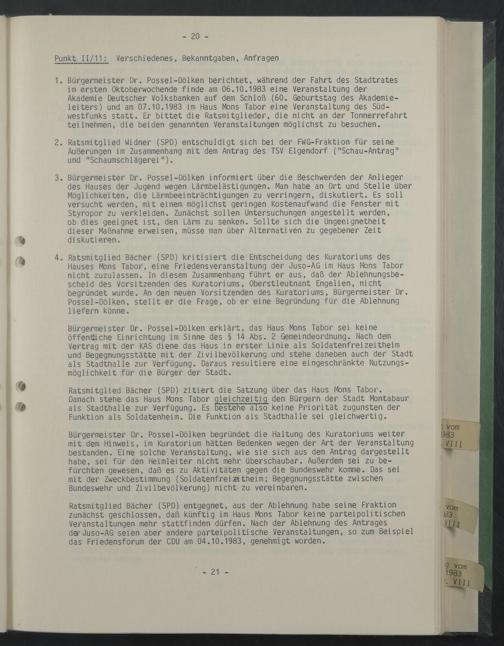 Ratsmitglied Bächer (SPD) entgegnet, aus der Ablehnung habe seine Fraktion zunächst geschlossen, daß künftig im Haus Mons Tabor keine parteipolitischen Veranstaltungen mehr stattfinden dürfen. Nach der Ablehnung des Antrages dar Juso-AG seien aber andere parteipolitische Veranstaltungen, so zum Beispiel das Friedensforum der CDU am 04.10.1983, genehmigt worden.