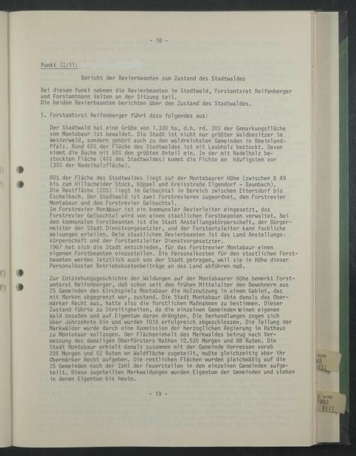 1967 hat sich die Stadt entschieden, für das Forstrevier Montabaur einen eigenen Forstbeamten einzustellen. Die Personal kosten für den staatlichen Forstbeamten werden letztlich auch von der Stadt getragen, weil sie in Höhe dieser Personal kosten Betriebskostenbeiträge an das Land abführen muß.