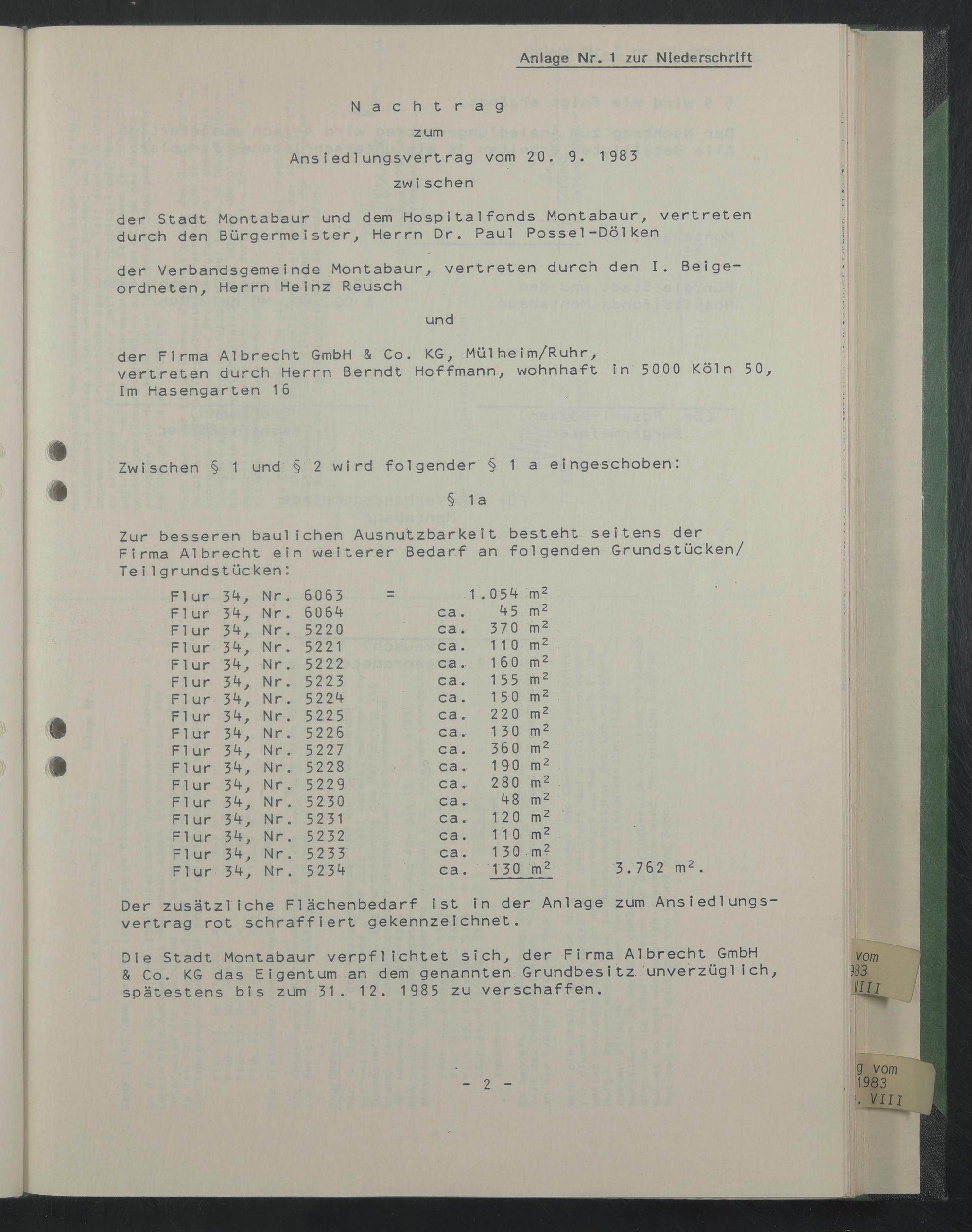 Die Stadt Montabaur verpflichtet sich, der Firma Albrecht GmbH & Co. KG das Eigentum an dem genannten Grundbesitz unverzüglich spätestens bis zum 31. 12. 1985 zu verschaffen.