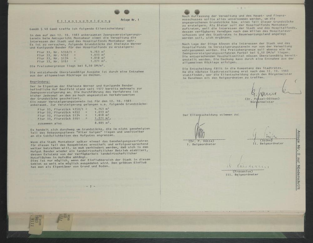 Da die nächste Stadtratssitzung erst nach dem 12. 10. 1983 stattfindet, war die Ellentscheldung durch den Bürgermeister Im Benehmen mit den Beigeordneten zu treffen.