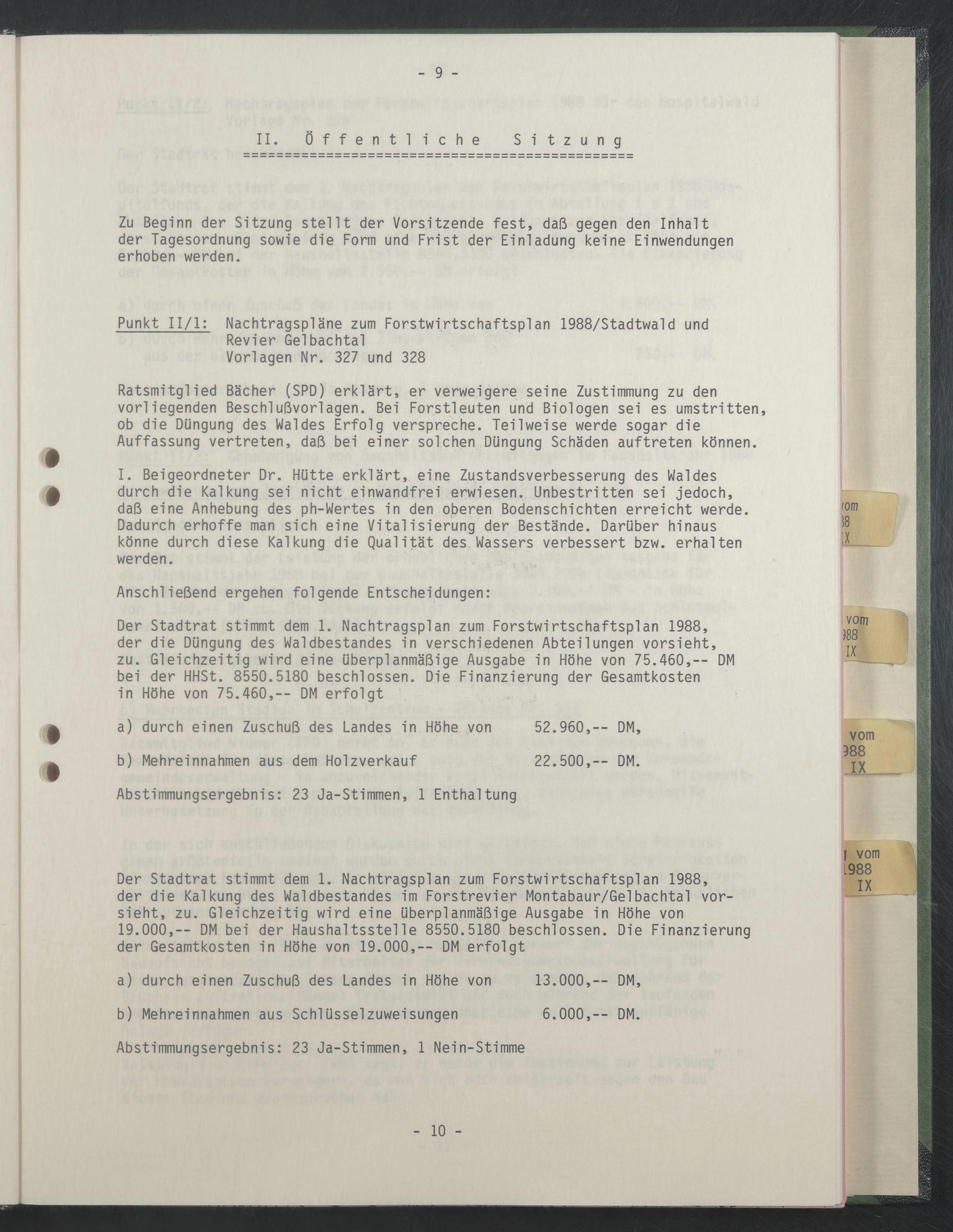 Punkt 11/1: Nachtragspläne zum Forstwirtschaftsplan 1988/Stadtwald und Revier Gelbachtal Vorlagen Nr. 327 und 328