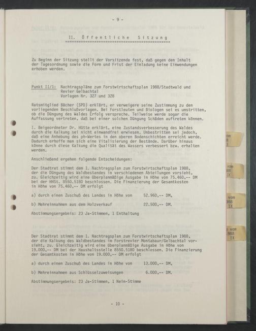 Ratsmitglied Bächer (SPD) erklärt, er verweigere seine Zustimmung zu den vorliegenden Beschlußvorlagen. Bei Forstleuten und Biologen sei es umstritten, ob die Düngung des Waldes Erfolg verspreche. Teilweise werde sogar die Auffassung vertreten, daß bei einer solchen Düngung Schäden auftreten können.