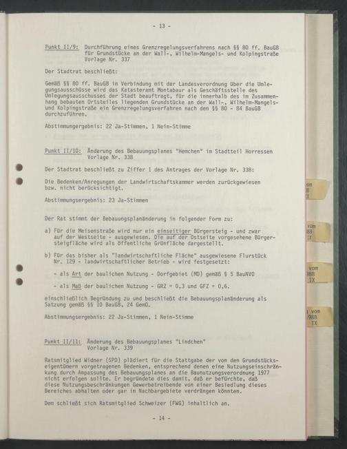 Ratsmitglied Widner (SPD) plädiert für die Stattgabe der von den Grundstückseigentümern vorgetragenen Bedenken, entsprechend denen eine Nutzungseinschränkung durch Anpassung des Bebauungsplanes an die Baunutzungsverordnung 1977 nicht erfolgen sollte. Er begründete dies damit, daß er befürchte, daß diese Nutzungsbeschränkungen Gewerbetreibende von einer Besiedlung dieses Bereiches abhalten oder gar in Nachbargebiete verdrängen könnten.