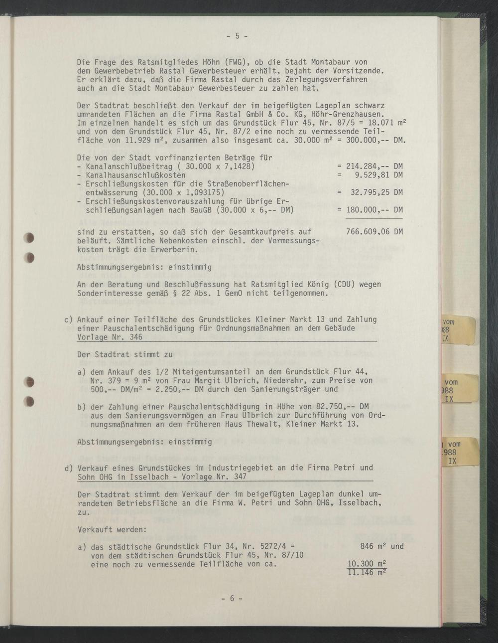 An der Beratung und Beschlußfassung hat Ratsmitglied König (CDU) wegen Sonderinteresse gemäß § 22 Abs. 1 GemO nicht teilgenommen.
