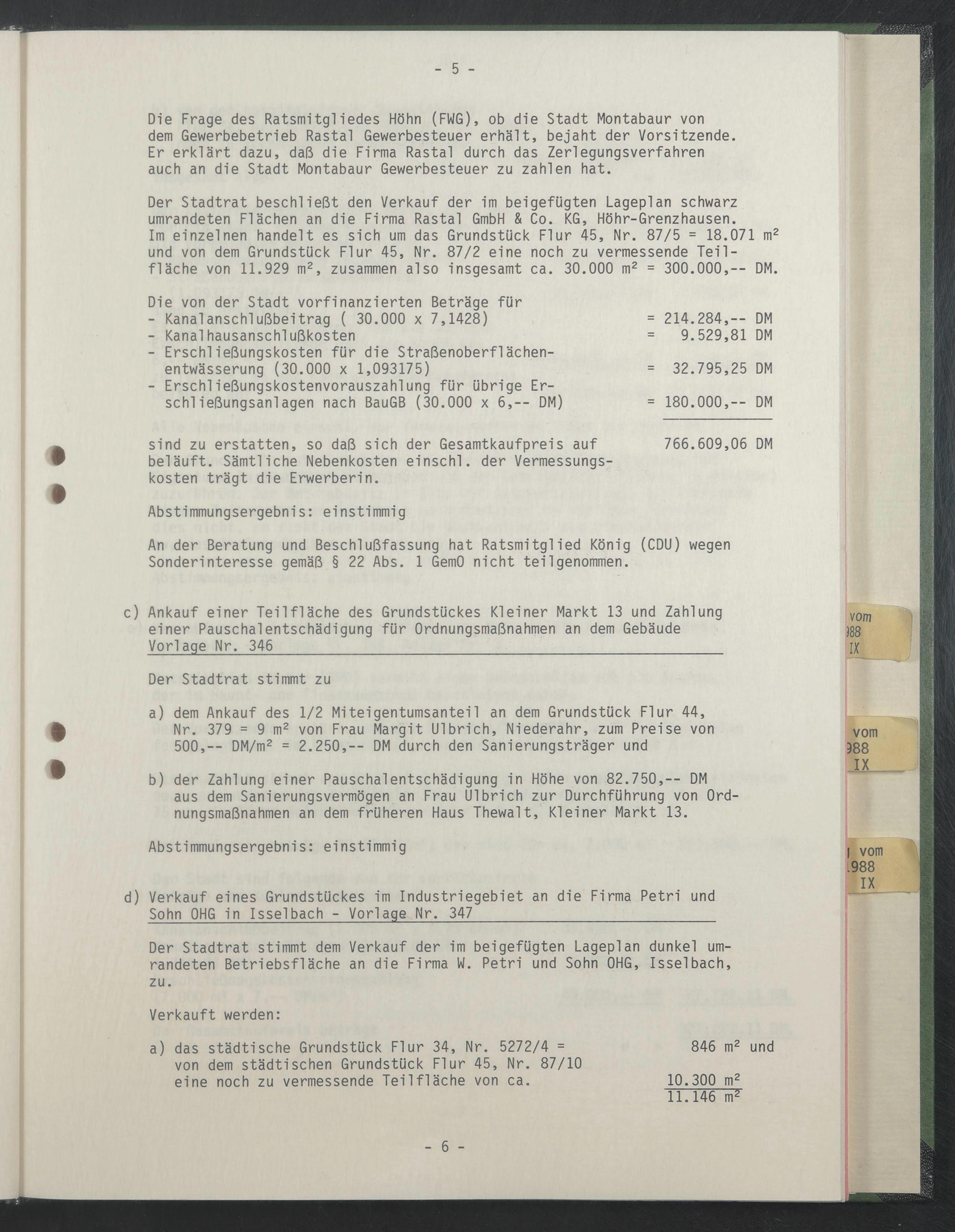 Der Stadtrat stimmt dem Verkauf der im beigefügten Lageplan dunkel umrandeten Betriebsfläche an die Firma W. Petri und Sohn OHG, Isselbach, zu.