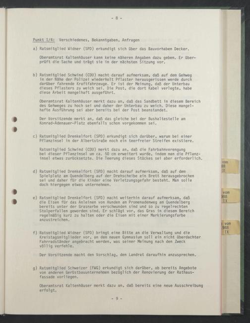 b) Ratsmitglied Schwind (CDU) macht darauf aufmerksam, daß auf dem Gehweg in der Nähe der Polizei wiederholt Pflaster herausgerissen werde durch darüber fahrende Kraftfahrzeuge. Er ist der Meinung, daß der Unterbau dieses Pflasters zu weich sei. Die Post, die dort Kabel verlegte, habe diese Arbeit mangelhaft ausgeführt.