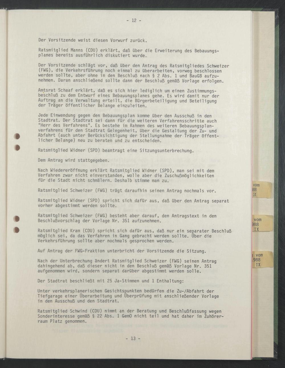 Nach Wiedereröffnung erklärt Ratsmitglied Widner (SPD), man sei mit dem Verfahren zwar nicht einverstanden, wolle aber die Zuschußmöglichkeiten für die Stadt nicht schmälern. Deshalb stimme man zu.
