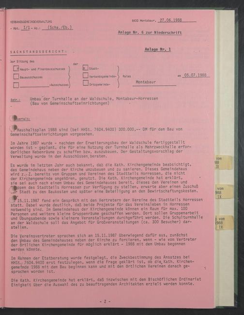 Im Rahmen der Etatberatung wurde festgelegt, die Zweckbestimmung des Ansatzes bei HHSt.'7604.9400 erst festzulegen, wenn die Frage geklärt ist, ob die^Kath. Kirchengemeinde 1988 mit dem Bau beginnen kann und mit den örtlichen Vereinen danach gesprochen worden ist.