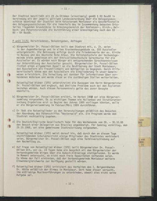 a) Bürgermeister Dr. Possel-Dölken teilt dem Stadtrat mit, z. Zt. seien ln der Jugendherberge und Im alten Krankenhausgebäude ca. 200 Aussledler untergebracht. Die Betreuung erfolge durch die Friedenswarte der ev. Kirche ln Nassau und das Deutsche Rote Kreuz. Die Volkshochschule der Verbandsgemeinde biete gemeinsam mit der Krelsvolkshochschule Sprachkurse für die Aussledler an. Es würden noch Bürger mit entsprechenden Sprachkenntnlssen zur Unterstützung der Aussledler gesucht. Bürgermeister Dr. Possel-Dölken richtet einen allgemeinen Appell an die Bevölkerung der Stadt Montabaur, den Aussledlern mit Freundlichkeit und Wohlwollen zu begegnen. Durch Hilfsbereitschaft könne man den Aussledlern die Eingliederung ln unser Gemeinwesen erleichtern. Die Verwaltung sei dankbar für Informationen über vorhandenen Wohnraum und werde diese an die zuständigen Stellen weiterleiten.