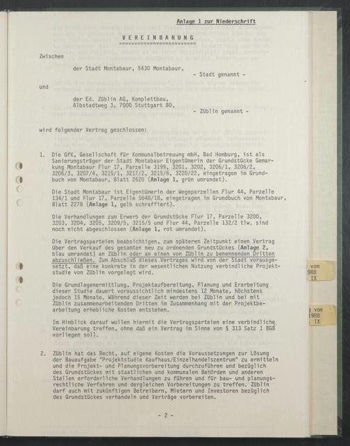 Die Vertragsparteien beabsichtigen, zum späteren Zeitpunkt einen Vertrag über den Verkauf des gesamten neu zu ordnenden Grundstückes (Anlage 2, blau umrandet) an Züblin oder an einen von Züblin zu benennenden Dritten abzuschließen. Zum Abschluß dieses Vertrages wird von der Stadt vorausge- setzt, daß eine konkrete in der wesentlichen Nutzung verbindliche Projektstudie von Züblin vorgelegt wird.