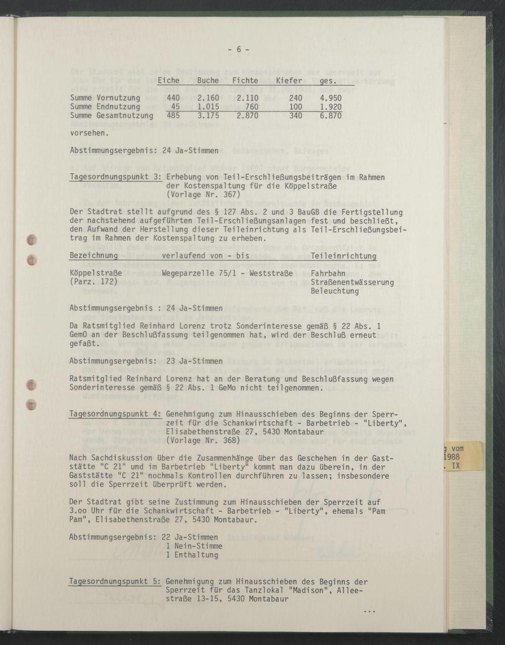 Der Stadtrat gibt seine Zustimmung zum Hinausschieben der Sperrzeit auf 3.oo Uhr für die Schankwirtschaft - Barbetrieb - "Liberty", ehemals "Pam Pam", Elisabethenstraße 27, 5430 Montabaur.