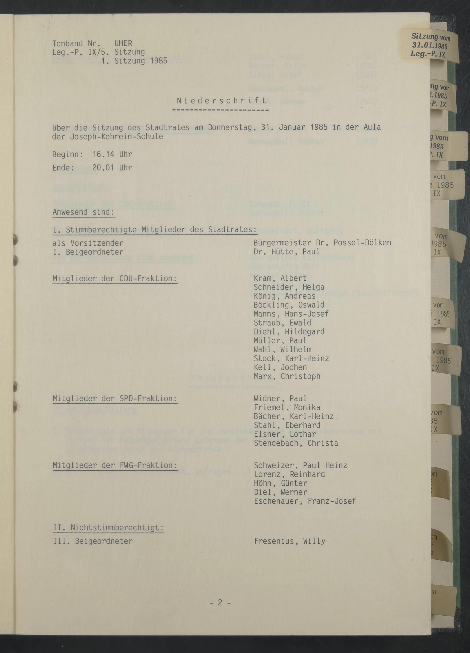 über die Sitzung des Stadtrates am Donnerstag, 31. Januar 1985 in der Aula der Joseph-Kehrein-Schule