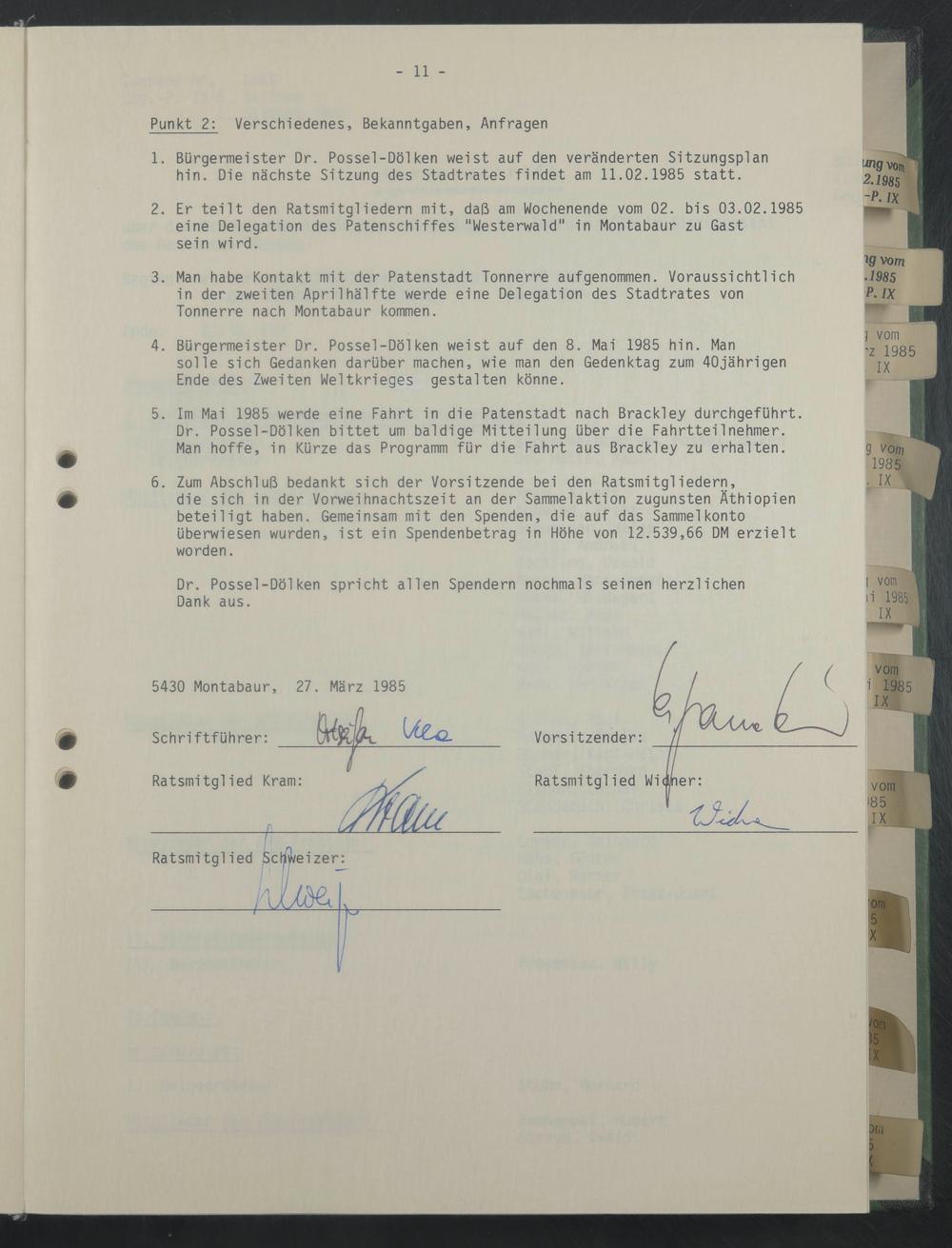 3. Man habe Kontakt mit der Patenstadt Tonnerre aufgenommen. Voraussichtlich in der zweiten April hälfte werde eine Delegation des Stadtrates von Tonnerre nach Montabaur kommen.