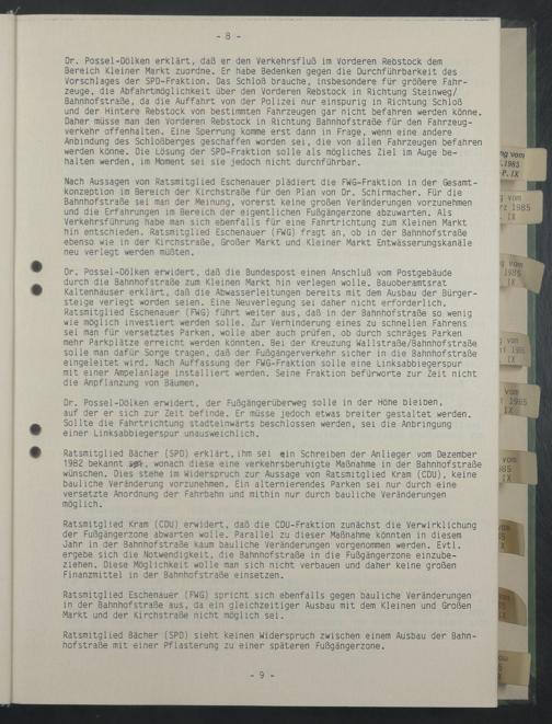 Ratsmitglied Bächer (SPD) erklärt,ihm sei ein Schreiben der Anlieger vom Dezember 1982 bekannt s%ir, wonach diese eine verkehrsberuhigte Maßnahme in der Bahnhofstraße wünschen. Dies stehe im Widerspruch zur Aussage von Ratsmitglied Kram (CDU), keine bauliche Veränderung vorzunehmen. Ein alternierendes Parken sei nur durch eine versetzte Anordnung der Fahrbahn und mithin nur durch bauliche Veränderungen möglich.