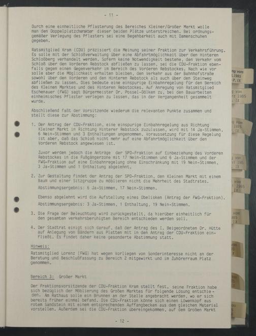 Zuvor werden jedoch die Anträge der SPD-Fraktion auf Einbeziehung des Vorderen Rebstockes in die Fußgängerzone mit 17 Nein-Stimmen und 6 Ja-Stimmen und der FWG-Fraktion auf eine Einbahnregelung ohne Einschränkung mit 19 Nein-Stimmen,