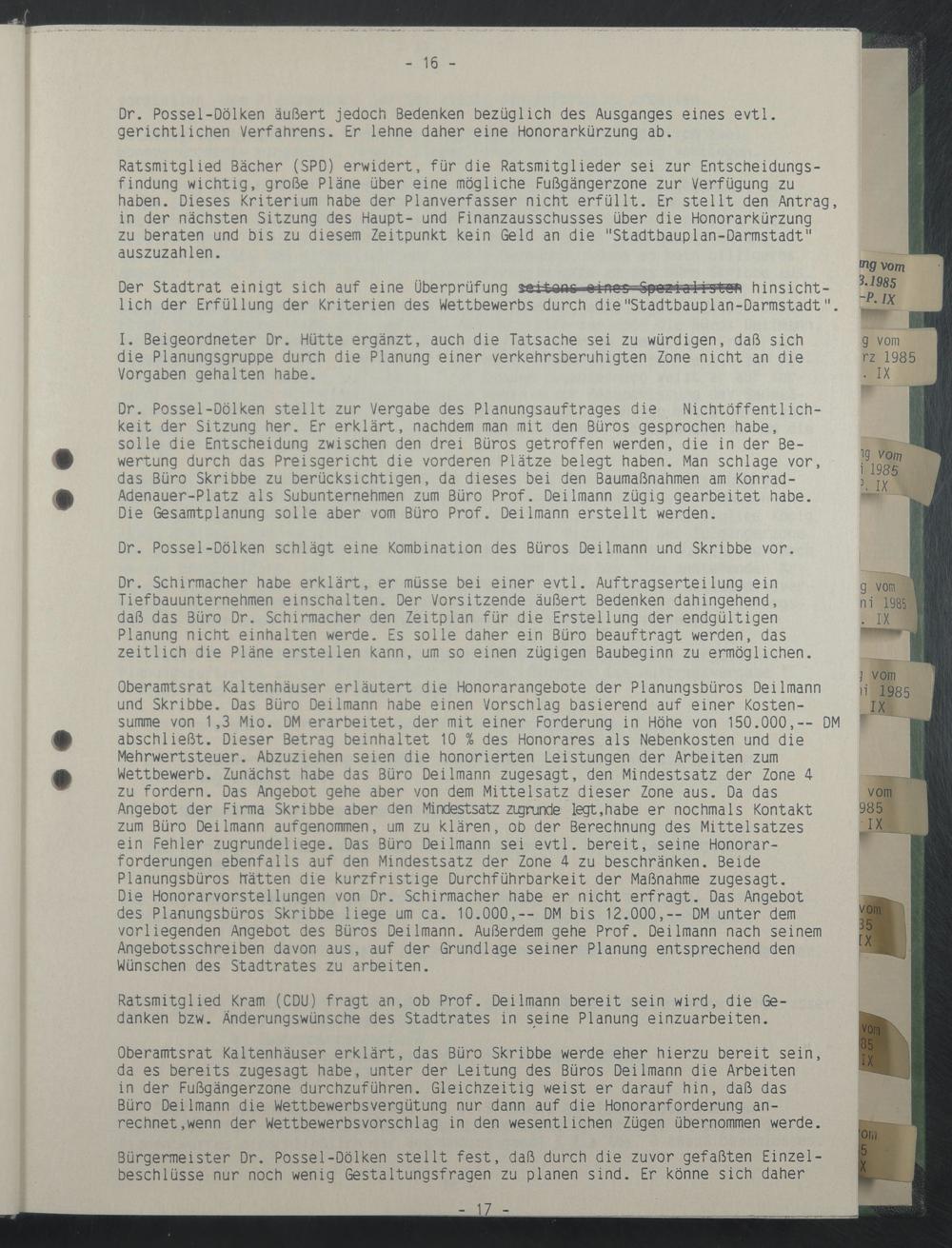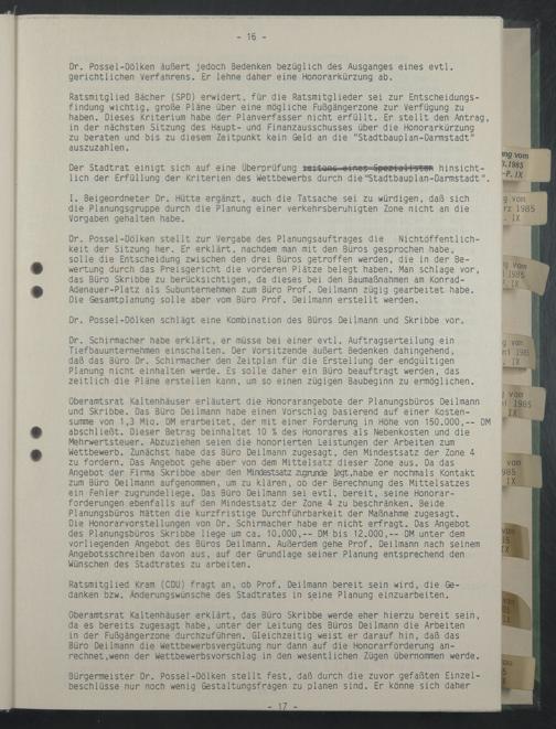 Oberamtsrat Kaltenhäuser erklärt, das Büro Skribbe werde eher hierzu bereit sein, da es bereits zugesagt habe, unter der Leitung des Büros Deilmann die Arbeiten in der Fußgängerzone durchzuführen. Gleichzeitig weist er darauf hin, daß das Büro Deilmann die Wettbewerbsvergütung nur dann auf die Honorarforderung anrechnet,wenn der Wettbewerbsvorschiag in den wesentlichen Zügen übernommen werde.