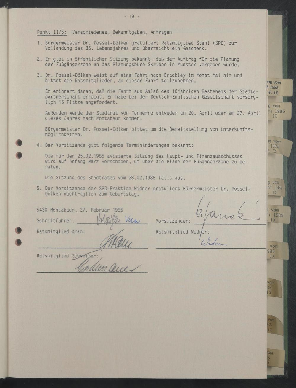 Die Sitzung des Stadtrates vom 28.02.1985 fällt aus.