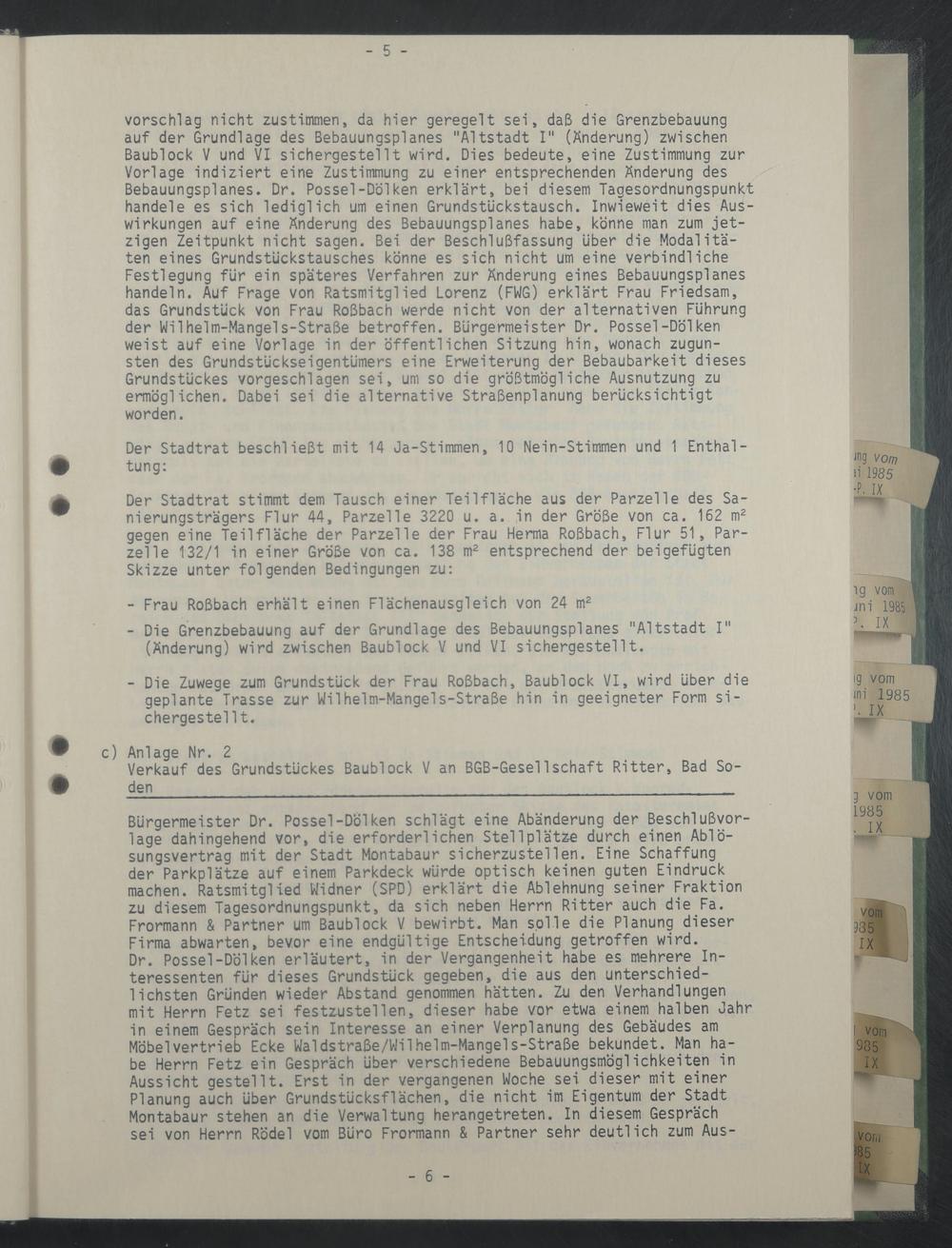 Vorschlag nicht zustimmen, da hier geregelt sei, daß die Grenzbebauung auf der Grundlage des Bebauungsplanes "Altstadt I" (Änderung) zwischen Baublock V und VI sichergestellt wird. Dies bedeute, eine Zustimmung zur Vorlage indiziert eine Zustimmung zu einer entsprechenden Änderung des Bebauungsplanes. Dr. Possel-Dolken erklärt, bei diesem Tagesordnungspunkt handele es sich lediglich um einen Grundstückstausch. Inwieweit dies Auswirkungen auf eine Änderung des Bebauungsplanes habe, könne man zum jetzigen Zeitpunkt nicht sagen. Bei der Beschlußfassung über die Modalitäten eines Grundstückstausches könne es sich nicht um eine verbindliche Festlegung für ein späteres Verfahren zur Änderung eines Bebauungsplanes handeln. Auf Frage von Ratsmitglied Lorenz (FWG) erklärt Frau Friedsam, das Grundstück von Frau Roßbach werde nicht von der alternativen Führung der Wilhelm-Mangels-Straße betroffen. Bürgermeister Dr. Posse!-Dölken weist auf eine Vorlage in der öffentlichen Sitzung hin, wonach zugunsten des Grundstückseigentümers eine Erweiterung der Bebaubarkeit dieses Grundstückes vorgeschlagen sei, um so die größtmögliche Ausnutzung zu ermöglichen. Dabei sei die alternative Straßenplanung berücksichtigt worden.